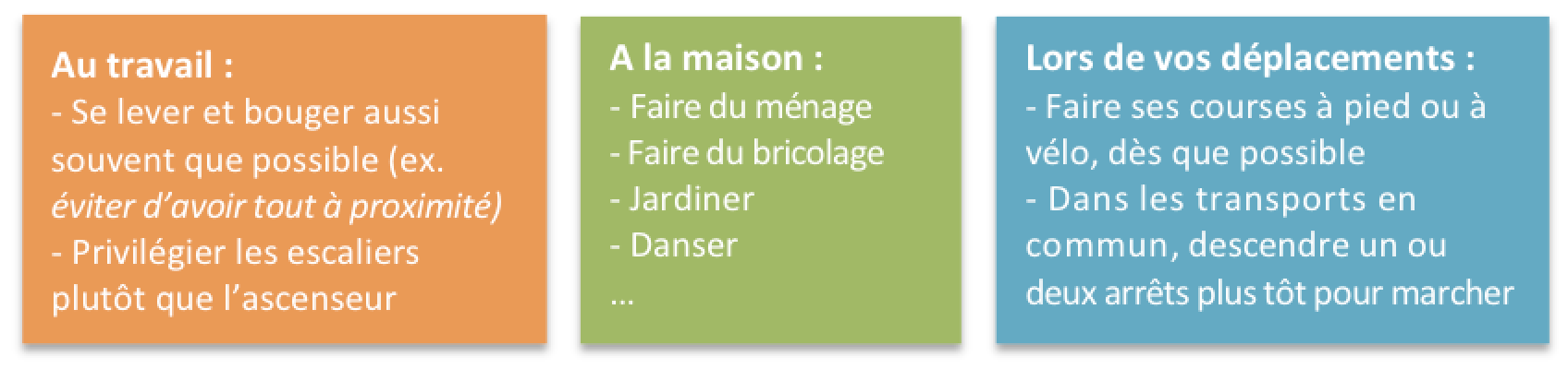 - Pratiquer chaque semaine au moins 150 min d'activité physique d'intensité modérée ou 75 min d'intensité soutenue.