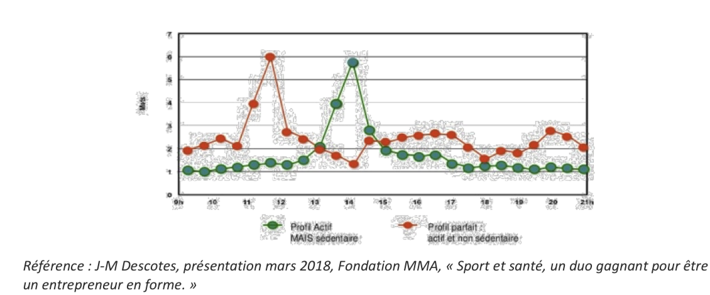 Être assis ou couché de maniere dominante plus de 3 heures consécutives par jour. L'activité physique même d'intensité modérée et soutenue n'empêche pas le comportement sédentaire !