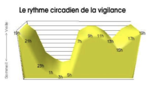 La baisse de vigilance due à la fatigue à certaines heures de la journée peut rendre improductif voire dangereux. En effet, selon l'association des sociétés francaise d'autoroutes (ASFA), 52 % des accidents de la route surviennent entre 4h et 6h du matin et 15h et 16h. Cela s'explique par la diminution du niveau de vigilance à ces horaires.