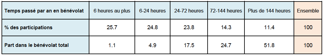 La durée moyenne annuelle d’une participation bénévole est de 68 à 75 heures. Mais environ le quart des participations les plus faibles ont une durée maximum de 6 heures par an; la moitié des participations ont une durée de 24 à 27 heures tout au plus tandis que 11 à 13 % ont des durées supérieures à 144 heures. Les plus impliqués totalisent 52 % des heures.