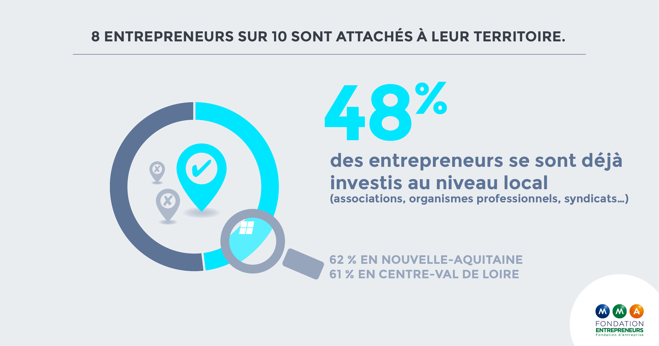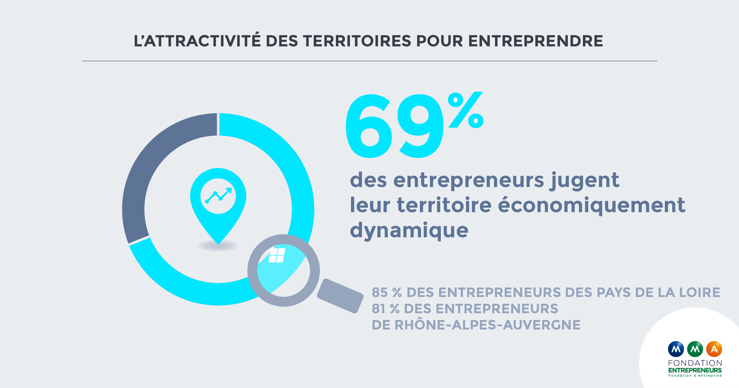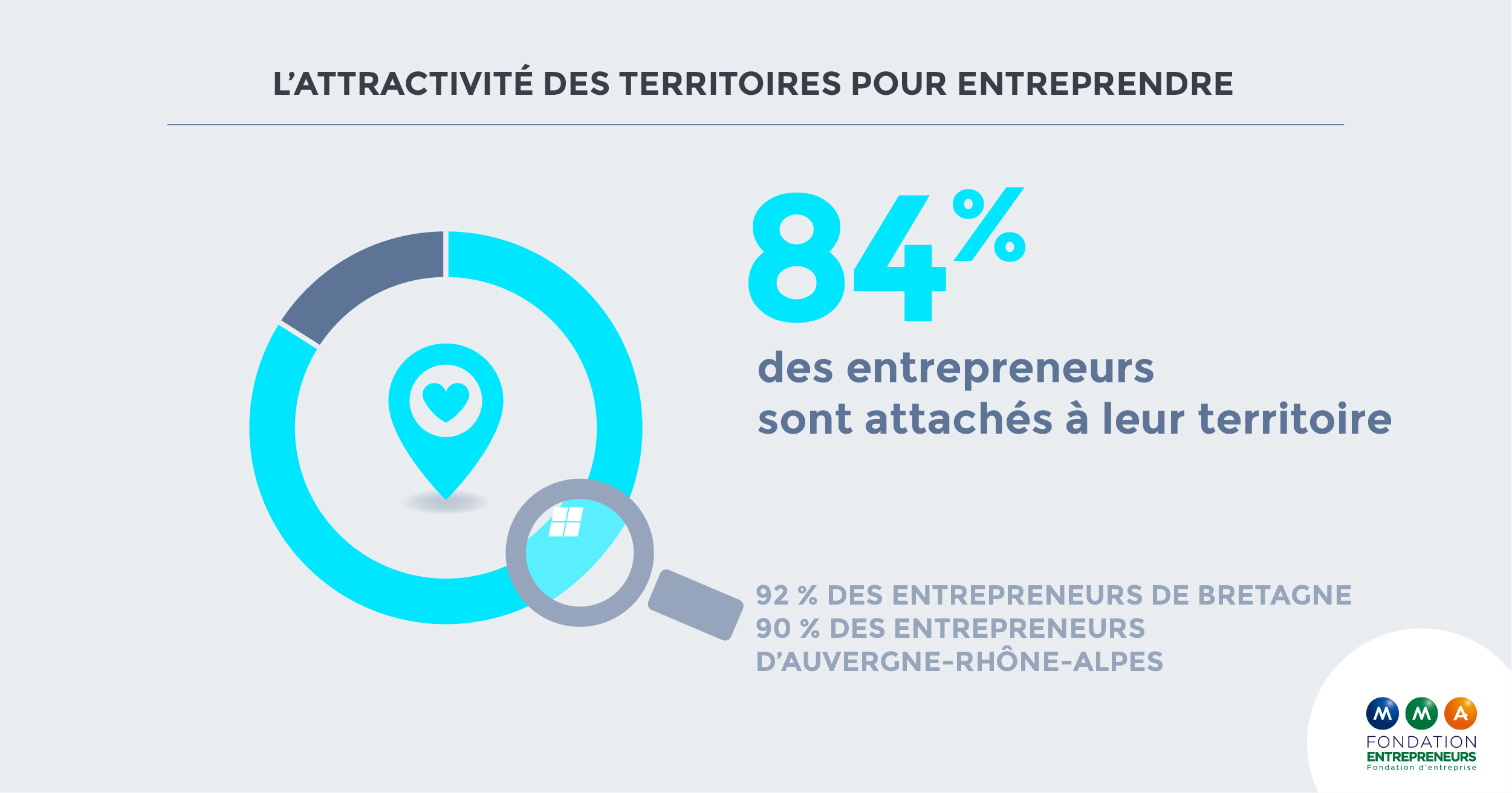 84 % des entrepreneurs disent être attachés à leur territoire (dont 37 % « très attachés »). Les raisons de cet attachement sont avant tout personnelles (54 %) mais également liées au dynamisme économique (42 %).