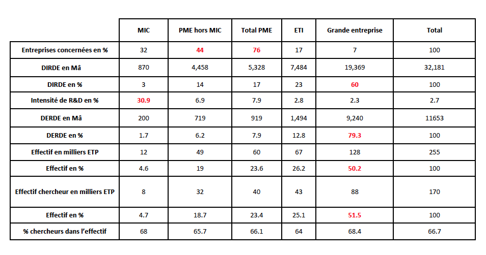 L’ensemble des PME représente plus des 3/4 des entreprises réalisant des activités internes de R&D, mais seulement 17 % de la DIRDE, 24 % des effectifs de recherche en entreprise et 23 % des chercheurs et ingénieurs de recherche mesurés en équivalent temps plein (ETP).