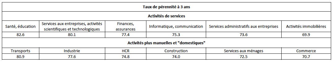 ♦ La pérennité est plus importante dans les activités plus intellectuelles (hors les transports), notamment de services et moins dans des activités plus manuelles et plus « domestiques », en intégrant aussi les types de clientèle (entreprises ou particuliers), et le positionnement des activités dans la conjoncture du moment :