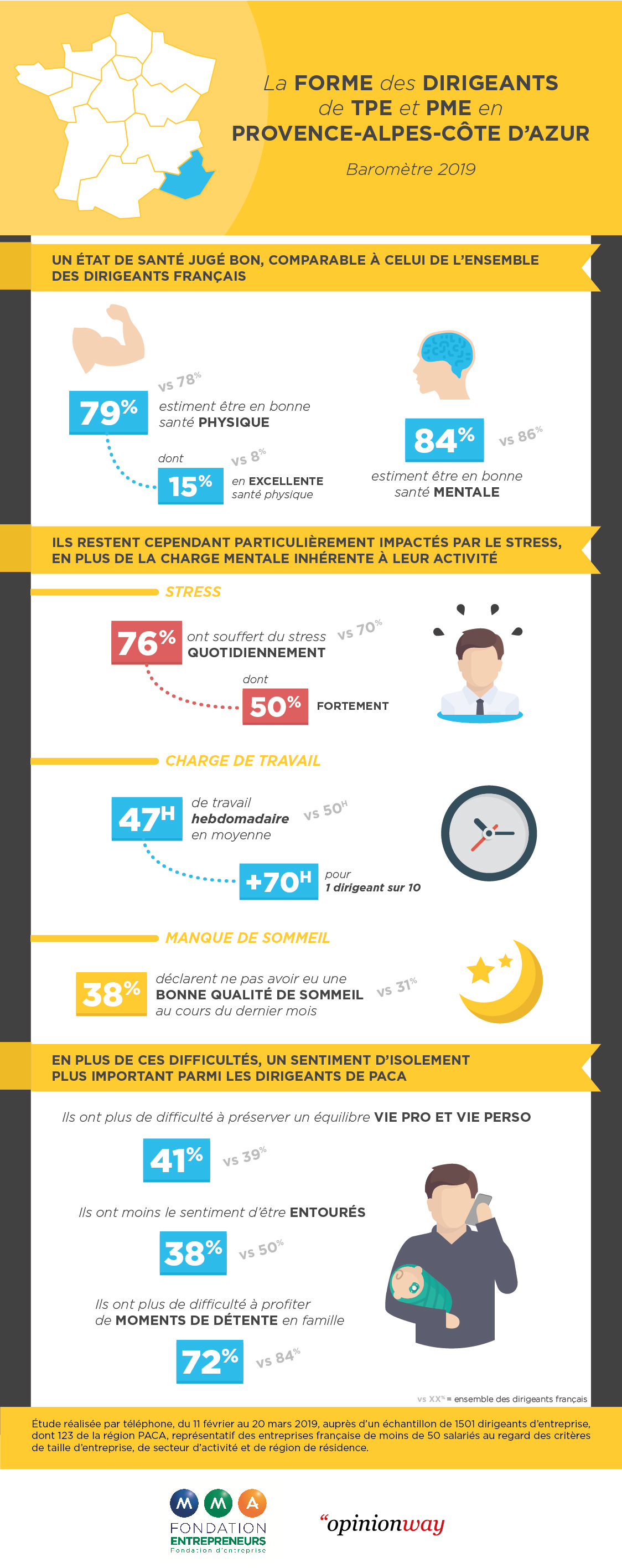 Les chefs d’entreprises de la région sont optimistes concernant leur santé mentale (84 %) et physique (79 %). Néanmoins, les maux physiques sont très présents avec le mal de dos cité à 68 % et les douleurs articulaires à 58 %. En plus des maux physiques, 4 entrepreneurs de la région PACA sur 10 ont des troubles du sommeil, voire une qualité de sommeil médiocre pour 13 % des sondés.