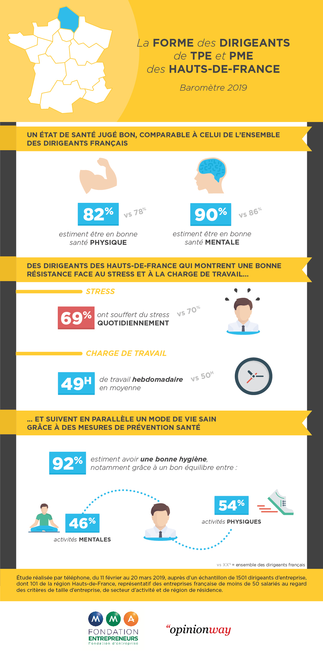 Plus de 9 entrepreneurs des Hauts-de-France sur 10 estiment avoir une bonne hygiène de vie notamment grâce à un bon équilibre entre activités physiques et activités mentales pour respectivement 54 % et 49 % des entrepreneurs de la région. Néanmoins, les maux physiques sont présents avec le mal de dos et les douleurs articulaires cités à 52 %, soit un chiffre nettement inférieur à la moyenne nationale (63 %).