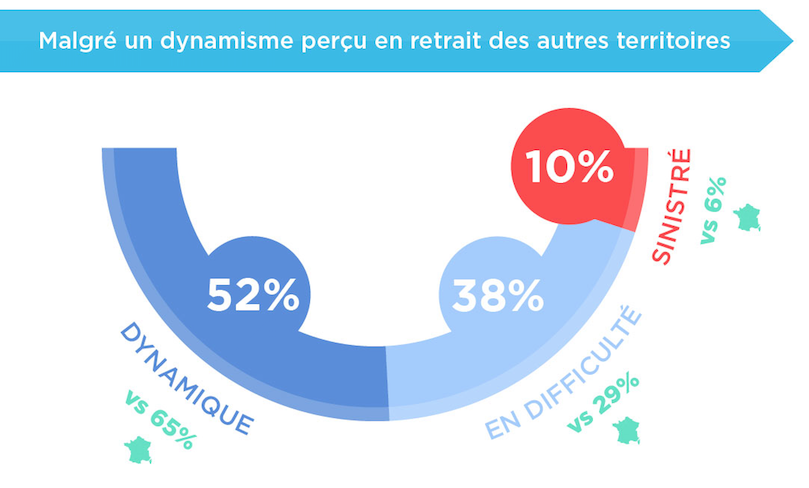 Malgré l’attachement fort qui lie les entrepreneurs normands à leur territoire, seul 1 sur 2 juge ce dernier dynamique (52 % contre 65 % au national). Pour 38 %, il serait en difficulté, voire sinistré (pour 10 %).