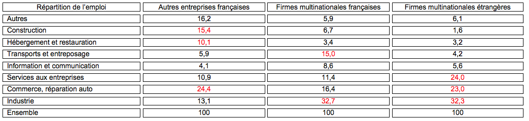 L’industrie manufacturière compte 32 % des emplois sous contrôle étranger en France, contre 26 % des emplois des firmes multinationales françaises et 12 % de ceux des autres entreprises françaises. Parmi les pays contrôlant plus de 50 000 emplois en France, le Japon, l’Italie, l’Allemagne et la Suède concentrent plus de 40 % de leurs emplois dans l’industrie, contre seulement respectivement 18 % et 15 % pour la Grande-Bretagne et les Pays-Bas.Les activités de services administratifs et de soutien, dont l’intérim, représentent le deuxième secteur le plus important avec 24 % des emplois sous contrôle étranger. Les trois principales entreprises d’intérim présentes en France sont étrangères; ainsi, un emploi sous contrôle étranger sur cinq s’exerce dans le secteur de l’intérim.