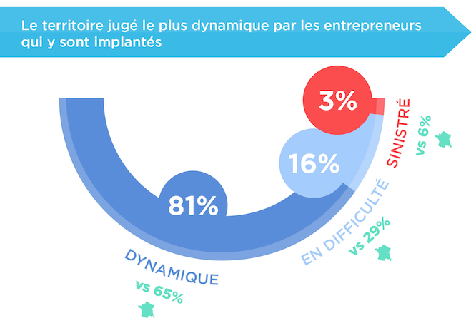 L’Ile-de-France est la région qui est jugée la plus dynamique en territoire d’entrepreneuriat (81 % vs 65 % dans l’ensemble). Seulement 16 % des entrepreneurs de la région (-13 pts par rapport au national) jugent leur territoire comme étant en difficulté et 3 % sinistré.