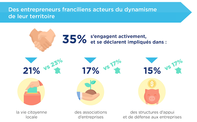 Les entrepreneurs d’Ile-de-France sont majoritairement acteurs du dynamisme de leur territoire. Ils sont plus de 35 % à déclarer s’investir activement (intensément ou assez fortement) dans des domaines tels que : la vie citoyenne locale, les associations d’entreprises ou encore des structures d’appui et de défenses aux entreprises.