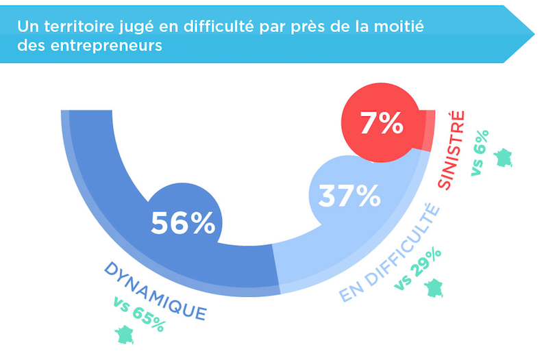 Une majorité des entrepreneurs de la région jugent le territoire du Grand-Est dynamique (56 % contre 65 % au national). Cependant, ils sont 37 % à le trouver en difficulté et 7 % sinistré.