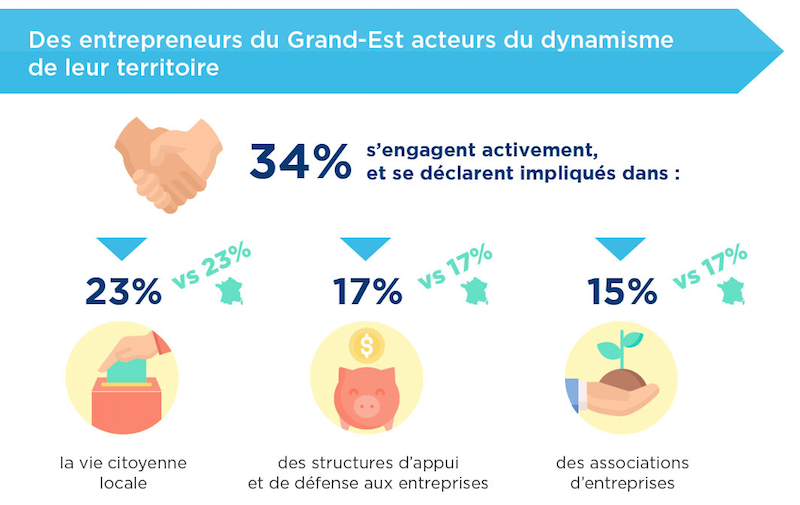 Les entrepreneurs de la région sont majoritairement acteurs du dynamisme de leur territoire. Ils sont plus de 34 % à déclarer s’investir activement (intensément ou assez fortement) dans des domaines tels que : la vie citoyenne locale, les associations d’entreprises ou encore des structures d’appui et de défenses aux entreprises.