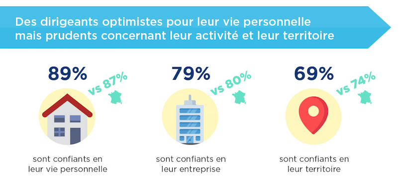 Concernant l’avenir, les entrepreneurs du territoire se montrent très majoritairement confiants pour leur vie personnelle, leur entreprise et leur territoire. Un niveau de confiance partagé par l’ensemble des dirigeants et qui varie peu selon les régions.