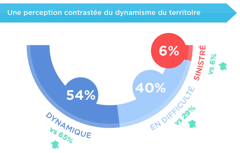 Le jugement des entrepreneurs vis-à-vis du dynamisme de leur région est partagé : ils sont 54 % à juger leur territoire dynamique (contre 65 % au national), 40 % à le juger en difficulté (29 % au national) et 6 % à le juger sinistré.