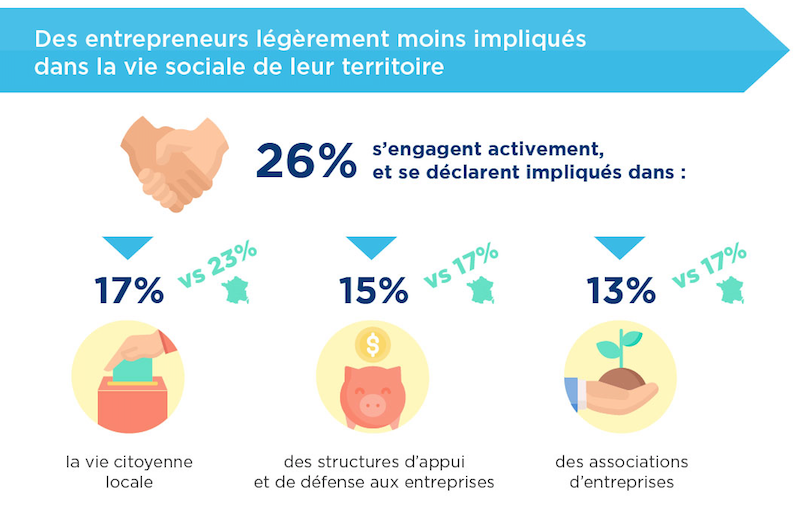 Les entrepreneurs de la région sont acteurs du dynamisme de leur territoire. Ils sont 26 % à déclarer s’investir activement (intensément ou assez fortement) dans des domaines tels que : la vie citoyenne locale, les associations d’entreprises ou encore des structures d’appui et de défenses aux entreprises.