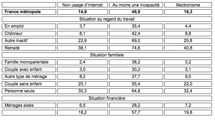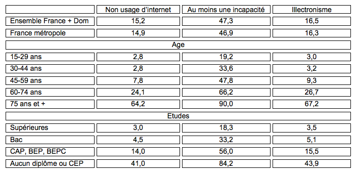Utiliser Internet ne garantit pas de posséder les compétences numériques de base. 37,9 % des usagers apparaissent manquer d’au moins une compétence dans les quatre domaines que sont la recherche d’information, la communication, l’utilisation de logiciels et la résolution de problèmes.Le défaut de compétence le plus répandu concerne l’usage de logiciel (34,5 %) devant la recherche d’information (10,7 %), la résolution de problèmes (8 %) et la communication (7,5 %). Parmi les usagers d’Internet :