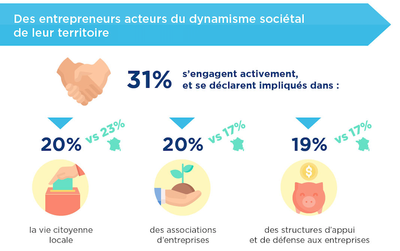 Les entrepreneurs de la région sont majoritairement acteurs du dynamisme de leur territoire. Ils sont 31 % à déclarer s’investir activement (intensément ou assez fortement) dans des domaines tels que : la vie citoyenne locale, les associations d’entreprises ou encore des structures d’appui et de défense aux entreprises.
