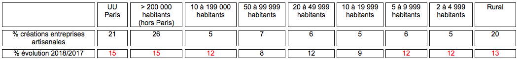 En 2018, 177.500 entrepreneurs ont créé une entreprise artisanale (dont 26 % des autoentrepreneurs), soit un nombre en hausse de 13 % par rapport à l’année précédente.52 % des créations le sont dans des unités urbaines d’au moins 100 000 habitants, 20 % dans des communes rurales, 18 % dans des villes comprises entre 10 000 et 100 000 habitants et 11 % dans des petites villes (entre 10 et 50 000 habitants).