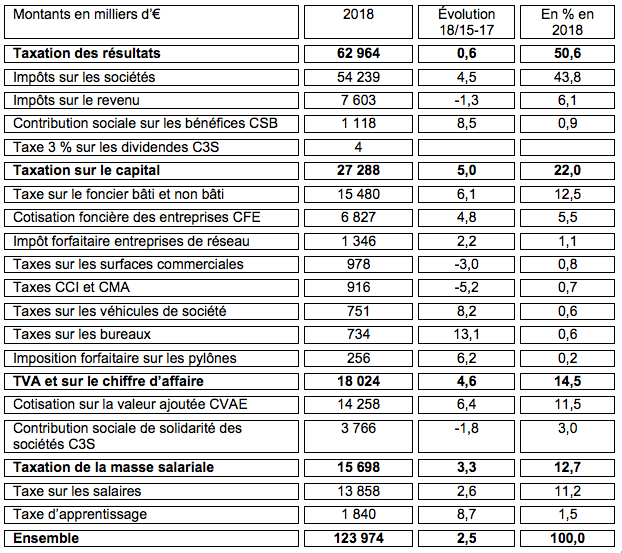 Entre 2018 et la moyenne 2015-2017 ont le plus progressé les taxes sur les bureaux (+13,1 %), la taxe d’apprentissage (+8,7 %), la contribution sociale sur les bénéfices CSB (+8,5 %), la taxe sur véhicules de société (+8, %), la cotisation sur la valeur ajoutée CVAE (+6,4 %), la taxe sur le foncier bâti et non bâti (+6,1 %).