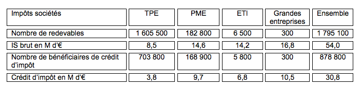 Les impôts société concernent 1 795 100 entreprises (1,9 million y sont assujetties) dont 1,6 million de TPE ; hors les TPE qui ne sont bénéficiaires d’un crédit d’impôt (impact du CICE) qu’à hauteur de 44 %, les autres tailles le sont entre 92 et 100 %.Parmi les redevables, 98 % sont des sociétés indépendantes et 130 000 sont membres d’un groupe fiscal (34 000 groupes).