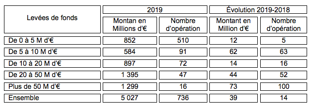 510 opérations (69 % des opérations) ont levés moins de 5 M € pour un montant de 852 M € (17 % des montants), vs 63 opérations (8,6 % des opérations) pour 2,694 Md € (53,6 % des montants).