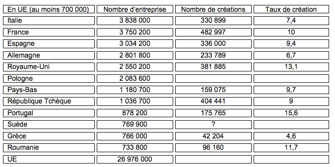 ⇒ Une comparaison du nombre d’entreprises et des créations est fournie par Eurostat, sachant que les définitions utilisées peuvent différer dans chaque pays de l’UE (exemple, l’existence ou non des micro-entrepreneurs). Tentant de rendre les données comparables, les chiffres fournis pour la France différent quelque peu de ceux proposés par l’Insee.