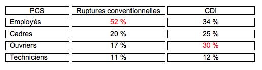 Elles sont aussi, bien plus le fait des employés (52 %), alors qu’ils 34 % des CDI ; par contre les ruptures conventionnelles touchent moins les ouvriers (17 % alors qu’ils sont 30 % des CDI) et les cadres (20 % alors qu’ils sont 25 % des CDI).