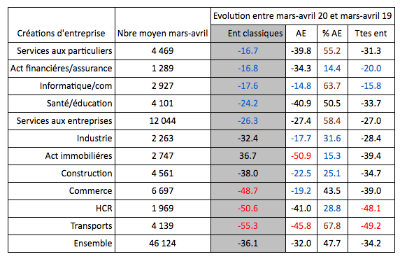 Analyse André Letowski sur les données brutes créations d'entreprise de l'Insee, mai 2020