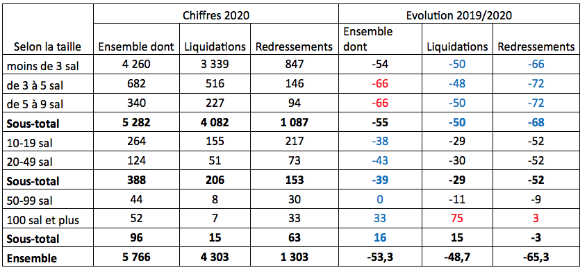 De fait les plus petites entreprises sont nettement plus liquidées que les tailles supérieures. Le taux de liquidation en 2020 est de fait plus important qu’en 2019 (77 % vs 70, mais surtout dans la tranche des 3-5 salariés 76 % vs 60).