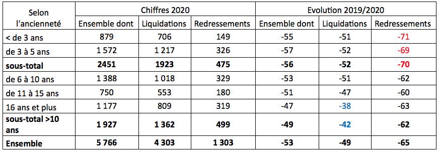 Si les baisses des défaillances sont globalement proches quelle que soit l’ancienneté de l’entreprise (-47 à - 55%), la baisse des liquidations est plus faible pour les 16 ans et plus (-38% vs -47), alors que la baisse des redressements est plus vigoureuse pour les moins de 5 ans (-70% vs -60 à -63). Ceci confirme ce que j’exprimais ci-dessus en termes de choix prioritaires des tribunaux de commerce.