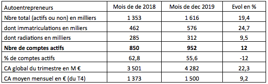 Ces entreprises ont cumulé au cours du 4éme trimestre 2019 un chiffre d’affaires de 4,3 Md€ contre 3,5 Md€ en 2018. Le chiffre d’affaires mensuel moyen est de 1 500 € (duquel il faut déduire les charges sociales, quelques frais et des achats pour ceux qui font de la revente en l’état).