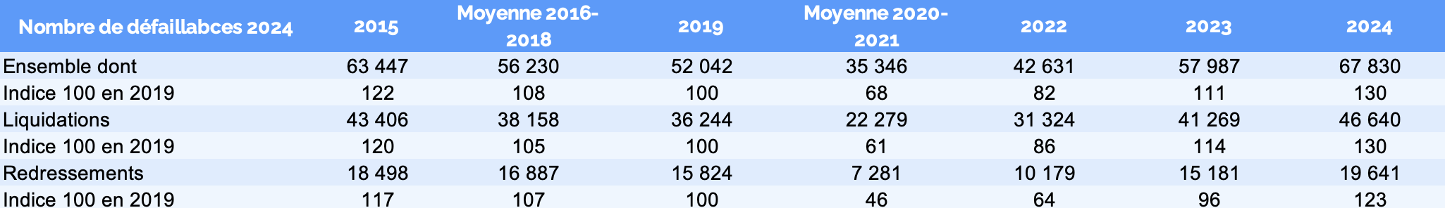 Entre 2023 et 2024 les redressements ont davantage progressé que les liquidations judiciaires (+29 % vs +13). En 2019, les liquidations judiciaires étaient de fait un peu plus nombreuses en proportion au sein des défaillances. Noter la situation en 2015 assez proche de celle de 2024.
