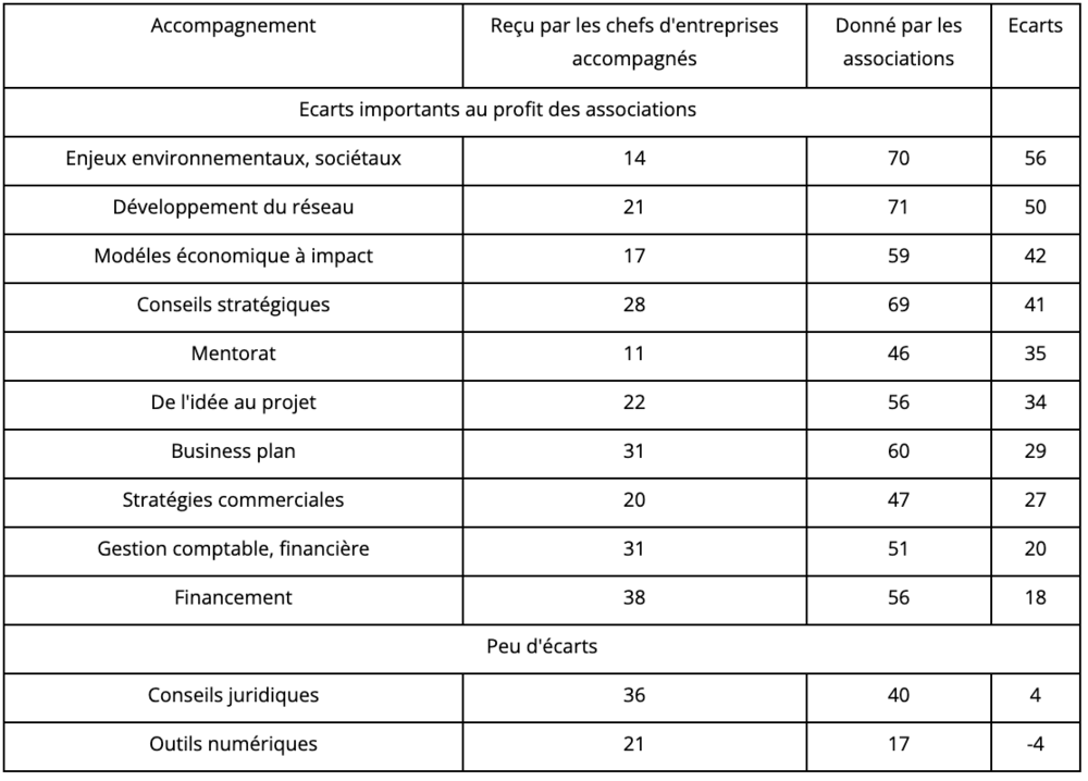 Les écarts les plus importants concerne le sociétal et les approches plus stratégiques : les enjeux environnementaux et sociétaux, le développement du réseau, la stratégie, le business plan, le type d’appui comme le mentorat, alors que la classique gestion comptable et financière et le conseil juridique manifestent nettement moins d’écarts.