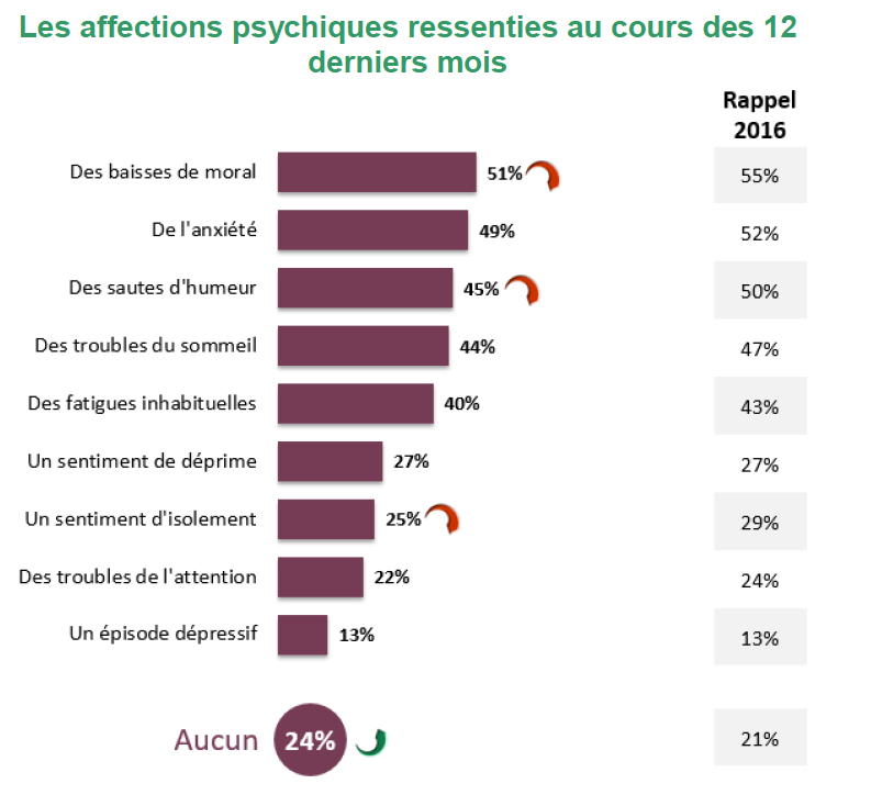 Les affections « psychiques » semblent moins présentes. 51 % des entrepreneurs interrogés avouent avoir connu une baisse de moral (contre 55 % en 2016) ; 49 % éprouvé de l’anxiété (52 % en 2016) et 45 % constaté des sautes d’humeur (50 % en 2016).