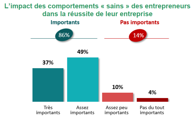 Les entrepreneurs sont très conscients de l’impact positif de certains comportements pour rester en forme. Ainsi pour 86 % une bonne alimentation, une qualité de sommeil, des activités physiques ou de réflexion pourraient agir sur la performance de l’entreprise.