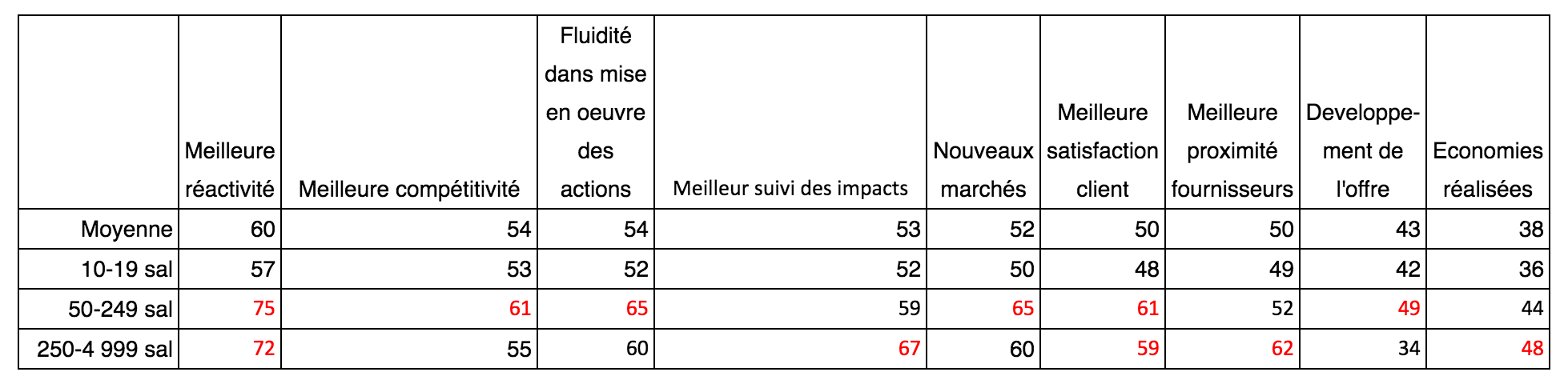 L'impact constaté est favorable aux entreprises qui ont stratégies et pratiques digitales : 51% ont connu une croissance de leur chiffre d'affaires en 2015 (vs 38% pour l'ensemble des entreprises); 69% l'escomptent pour 2016 (vs 45); 50% prévoient des recrutements en 2016 (vs 36). De façon plus développée les bénéfices de la transaction numérique en termes marketing et commercial sont :