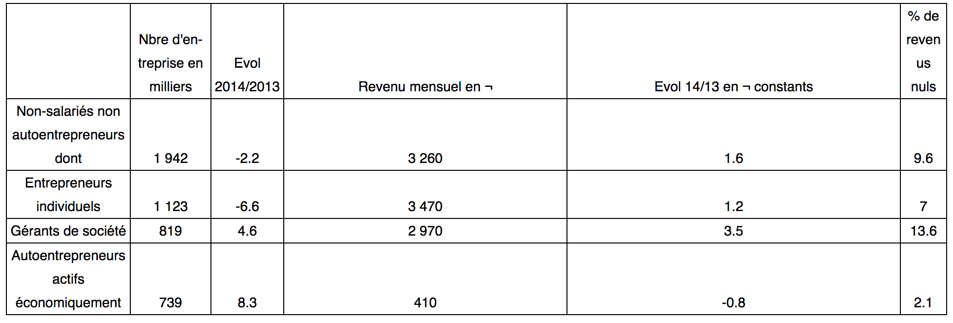 Les effectifs augmentent de 0,5% sur l'année, après +5,1% en 2013 et +5,4% en 2012, du fait des autoentrepreneurs (+8,3%), alors que le nombre de non-salariés «classiques» diminue de 2,2% : –6,6% pour les entrepreneurs individuels (contre –0,3% en 2013), alors que le nombre de gérants de sociétés se poursuit (+4,6%, après +5,1% en 2013).