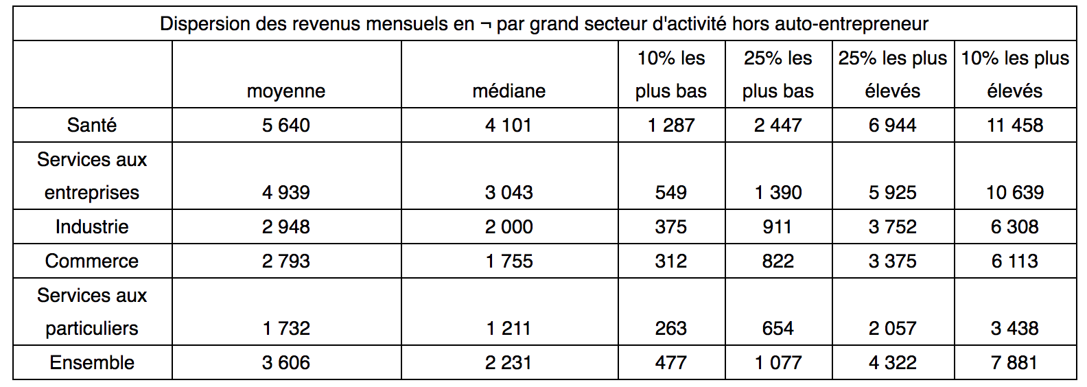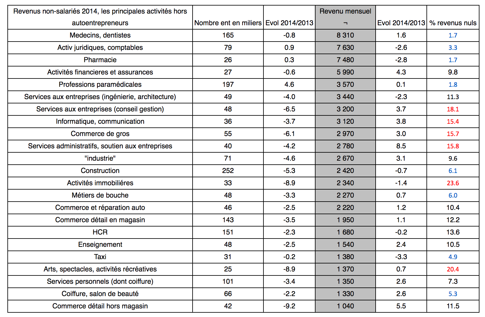 De façon plus détaillée, le tableau ci-après liste les principaux métiers; aux extrêmes le commerce de détail hors magasin génère les revenus les plus faibles (1 040€), derrière la coiffure et les soins de beauté, les activités artistiques et récréatives, les taxis et les autres services personnels (de 1 330 à 1 410€), alors que les médecins et dentistes perçoivent les revenus les plus élevés (8 310€), devant les professions juridiques et comptables (7 630€) et le commerce pharmaceutique (7 480€).