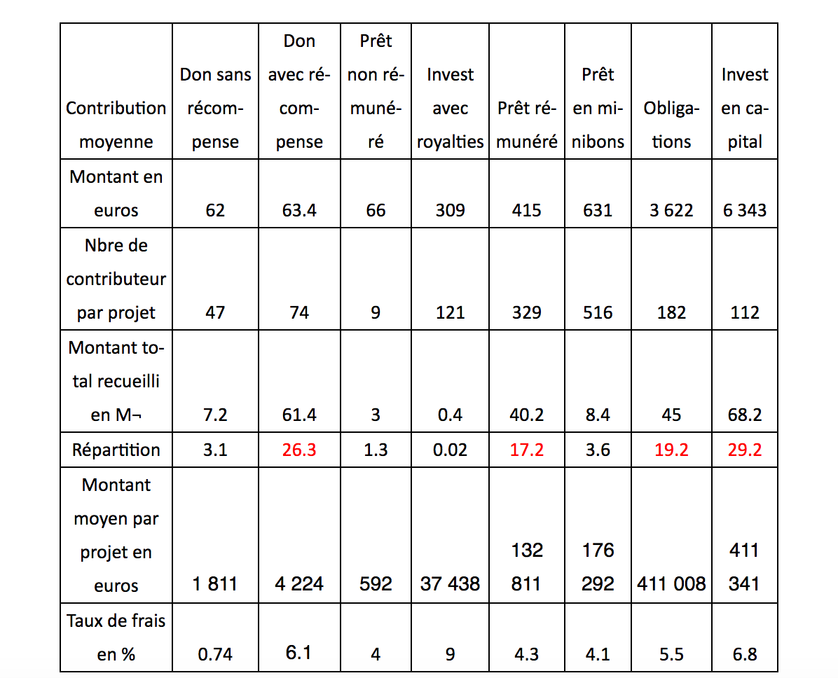 Les contributions moyennes, le nombre moyen de contributeurs et le montant moyen des projets divergent beaucoup selon le produit. Noter que le taux de succès pour que le projet se fasse est important (mais un travail de filtrage et d'accompagnement explique cela, ce qui est beaucoup moins le cas aux USA) : 75% pour les dons, 84% pour l'investissement en capital, 94% pour les prêts.