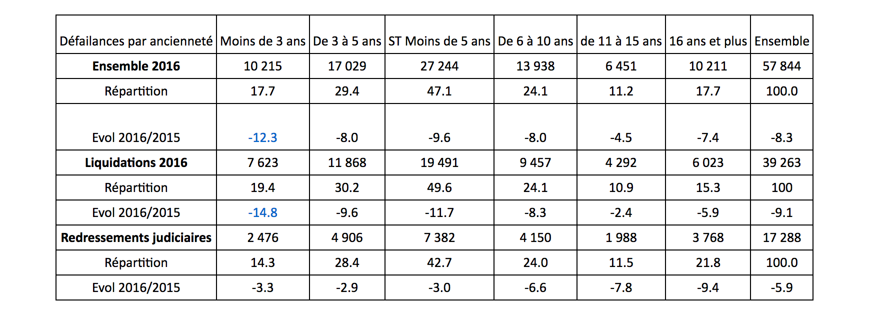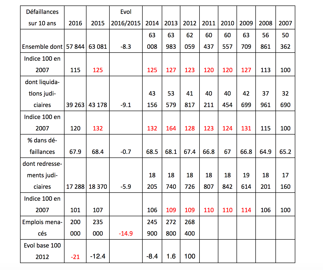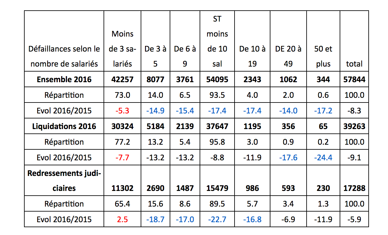 En ce qui concerne l'année entière 2016, le nombre de défaillances est de 57 844 en diminution de 8,3% au regard de 2015; 68% sont le fait de liquidations judiciaires (une situation qui bouge peu entre 2007 et 2016), 30% de redressements judiciaires et 2% de plans de sauvegarde. On retrouve en 2016, une situation comparable à 2008.