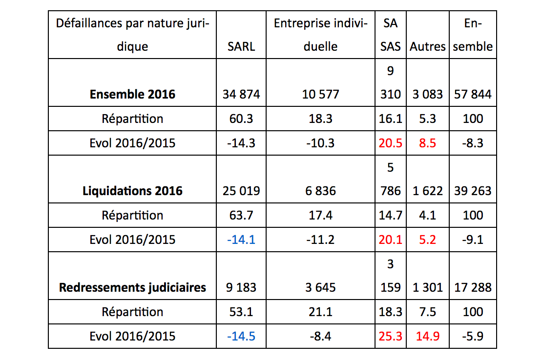 En matière de forme juridique, les défaillances sont de loin le fait de sociétés (82%), notamment de Sarl (60%), mais les hausses entre 2015 et 2016 sont le fait des SA et SAS (en forte hausse dans les créations d'entreprise) avec une hausse de 20%; les défaillances dans les autres formes de société sont en hausse de 8,5%, alors que les Sarl, non comprises dans ces sociétés autres, sont en baisse de 14%. Les défaillances des entreprises en nom individuel sont aussi en baisse de 10% (en baisse aussi au sein des nouvelles entreprises).