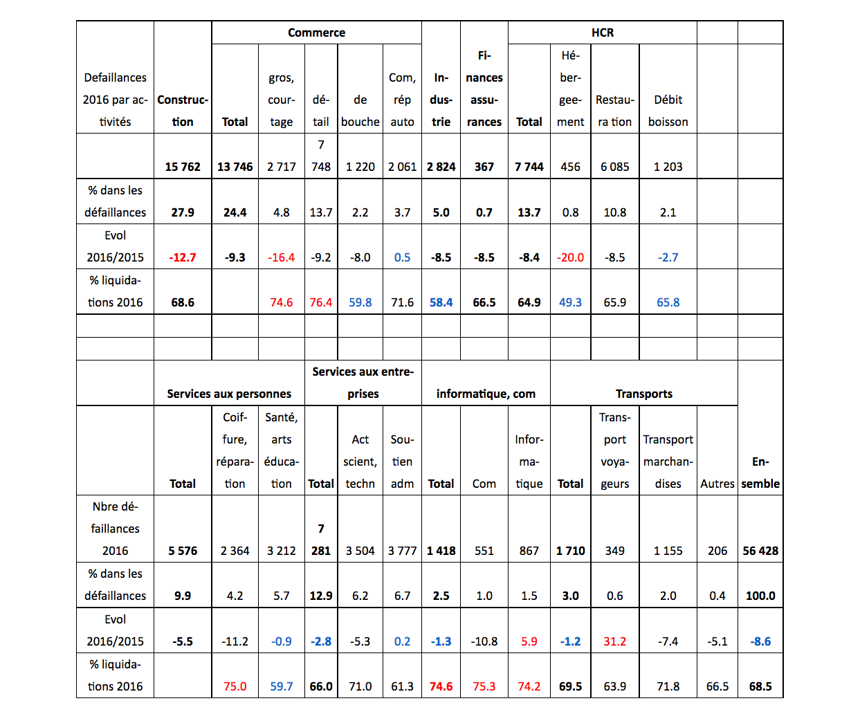 En termes d'activités, les défaillances sont les plus nombreuses dans la construction (27,9% des défaillances 2016), puis le commerce (24,4%, 38,1% si l'on intégrait les HCR dans le commerce), et ensuite les services aux entreprises (15,4% si l'on intègre l'informatique et la communication), devant les services aux personnes (10%).