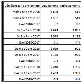 En ce qui concerne l’ancienneté des entreprises, les liquidations sont stables dans les plus récentes (les moins de 5 ans), alors qu’en redressement la situation est plus favorable :