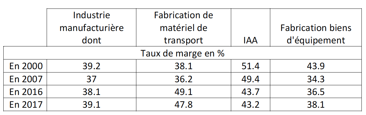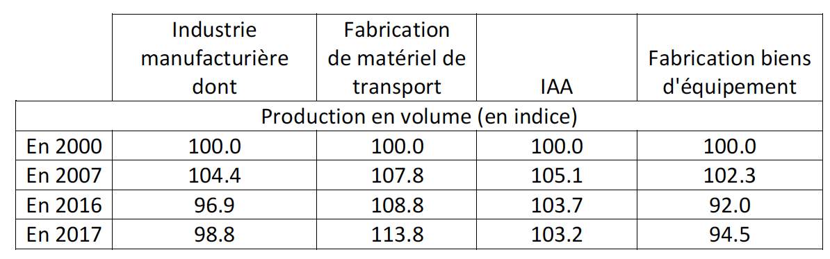 En 2017, comparé à 2000, l’indice est de 113,8 pour le matériel de transport, 103,2 pour les IAA et 94,5 pour la fabrication de biens d’équipement.