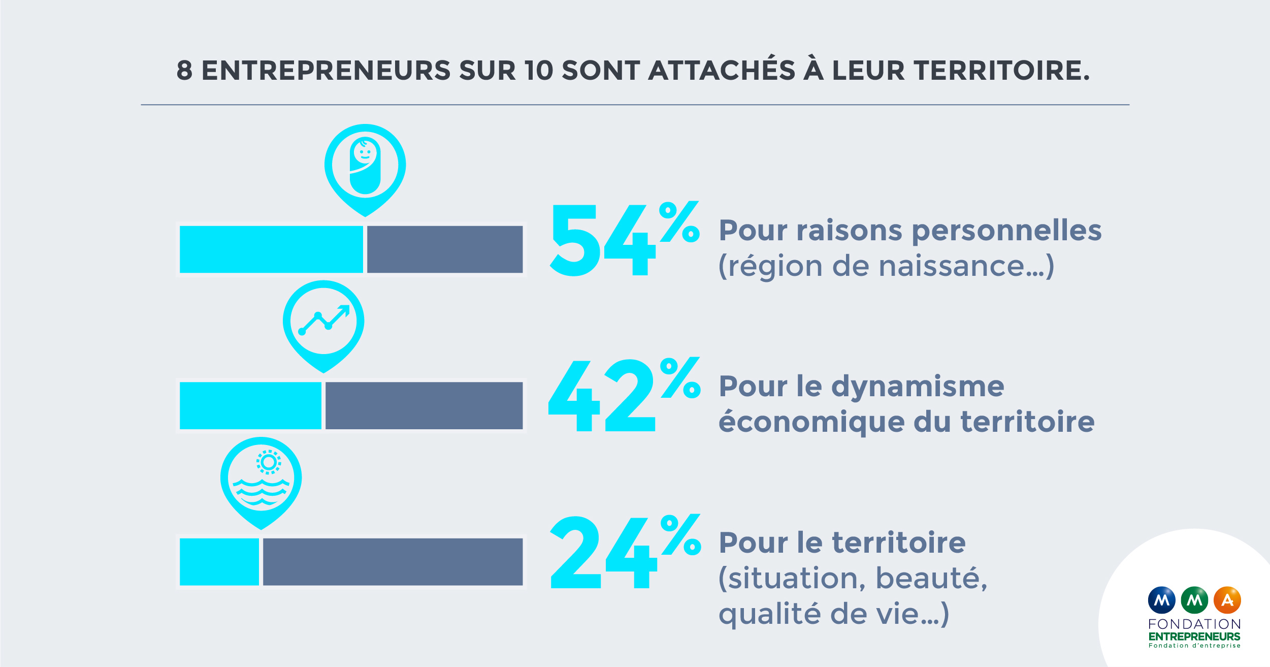 84 % des entrepreneurs disent être attachés à leur territoire (dont 37 % « très attachés »). Les raisons de cet attachement sont avant tout personnelles (54 %) mais également liées au dynamisme économique (42 %).