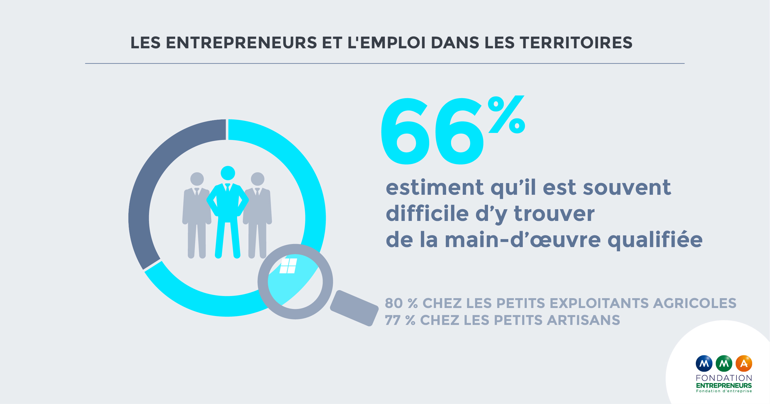 Bien que la majorité des entrepreneurs estiment que le territoire où est implantée leur entreprise est économiquement dynamique (69 %), 66 % déclarent éprouver des difficultés à trouver des salariés pour les postes recherchés sur leur région. C’est surtout le cas chez les petits exploitants agricoles (80 %) et les artisans (77 %). 40 % des entrepreneurs jugent le contexte économique moins propice à la création d’entreprise qu’il y a 12 mois.
