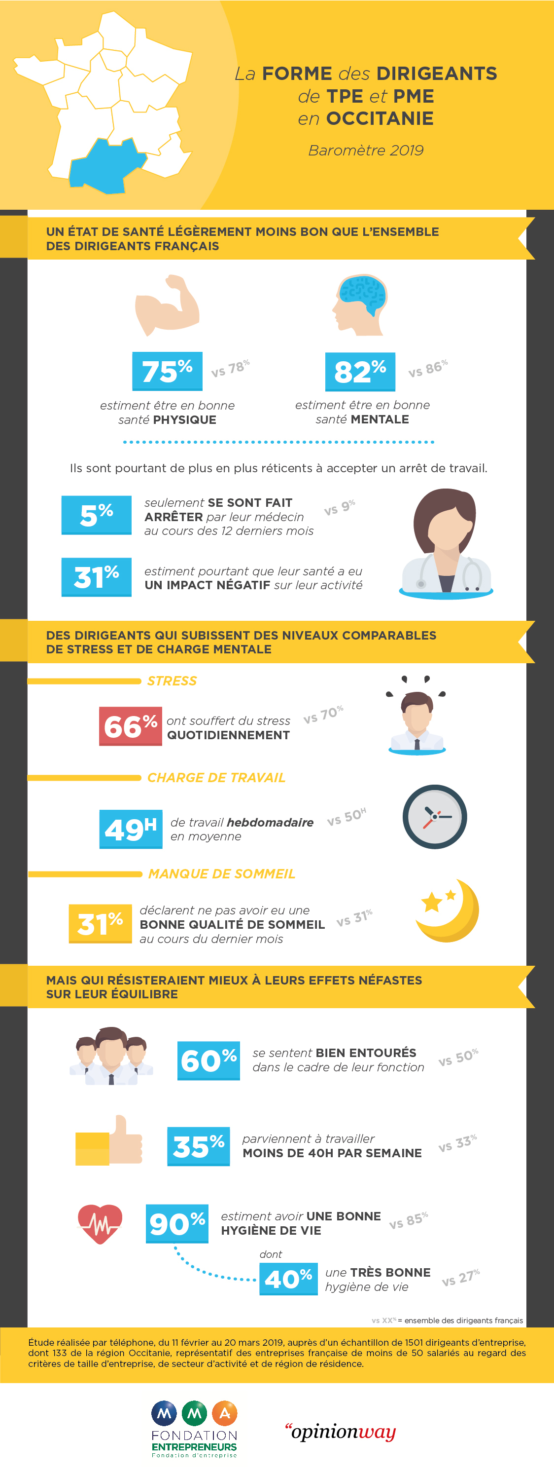 Malgré un niveau inférieur à la moyenne national, le stress touche 66 % des dirigeants de la région. On constate que les facteurs de stress en Occitanie sont liés principalement à la surcharge de travail, pour 6 entrepreneurs sur 10, et au manque de trésorerie, pour la moitié des dirigeants.De plus, 26 % des dirigeants révèlent que les difficultés à licencier auraient un impact très fort sur leur stress (un taux supérieur de 14 points par rapport au national).