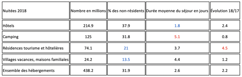 La fréquentation dans l’hôtellerie en 2018 s’accroît de 2,4 % malgré la concurrence des hébergements individuels proposés par des particuliers via des plateformes internet, du fait de la clientèle non résidente (les nuitées en hôtels augmentent de 7,6 % du fait notamment des clientèles américaine et japonaise), alors que la fréquentation des résidents baisse de 0,6 %. Avec 215 millions de nuitées en 2018, l’hôtel est toujours le premier mode d’hébergement collectif, devant l’hôtellerie de plein air (125 millions de nuitées en hausse de 0,8 % imputable à la clientèle non résidente, notamment allemande et britannique).