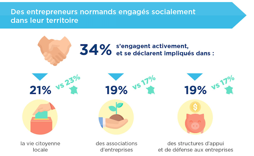 Les entrepreneurs de la région Normandie sont majoritairement acteurs du dynamisme de leur territoire. Ils sont plus de 34 % à déclarer s’investir activement (intensément ou assez fortement) dans des domaines tels que : la vie citoyenne locale, les associations d’entreprises ou encore des structures d’appui et de défenses aux entreprises.