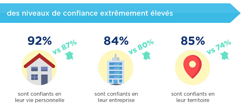 Concernant l’avenir, les entrepreneurs du territoire se montrent très majoritairement confiants pour leur vie personnelle, leur entreprise et leur territoire, au-delà de leur confrères au niveau national.