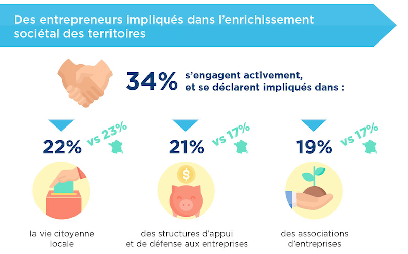 Les entrepreneurs de Bretagne sont majoritairement acteurs du dynamisme de leur territoire. Ils sont plus de 34 % à déclarer s’investir activement (intensément ou assez fortement) dans des domaines tels que : la vie citoyenne locale, les associations d’entreprises ou encore des structures d’appui et de défenses aux entreprises.